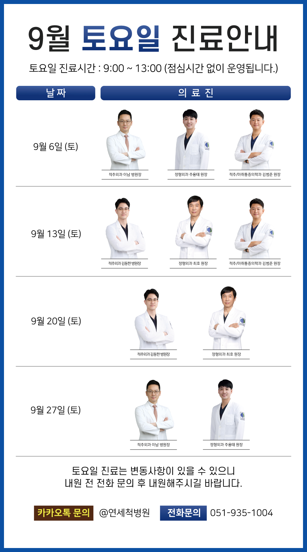 2025년 9월 토요일진료/과별 진료안내 연세척병원 | 2025-08-21 | 377 회 2025년 9월 토요일 진료일정 안내드립니다. 내원 전 꼭 스케줄을 확인해주세요^^ 051) 935-1004 토요일진료안내-홈페이지1.jpg ( 49.22 [Kb] ) 윗글 ▲ 추석연휴 진료안내 아랫글 ▼ 2025년 광복절 휴진 안내 목록보기 글작성 시 입력하셨던 비밀번호를 입력하세요.