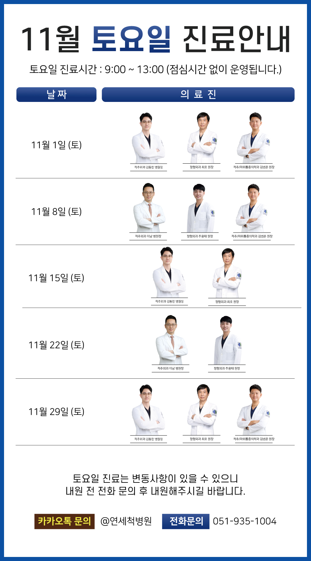 2025년 11월 토요일진료/과별 진료안내 연세척병원 | 2025-10-13 | 131 회 2025년 11월 토요일 진료일정 안내드립니다. 내원 전 꼭 스케줄을 확인해주세요^^ 051) 935-1004 윗글 ▲ 등록된 글이 없습니다. 아랫글 ▼ 2025년 10월 토요일진료/과별 진료안내 목록보기 글작성 시 입력하셨던 비밀번호를 입력하세요.