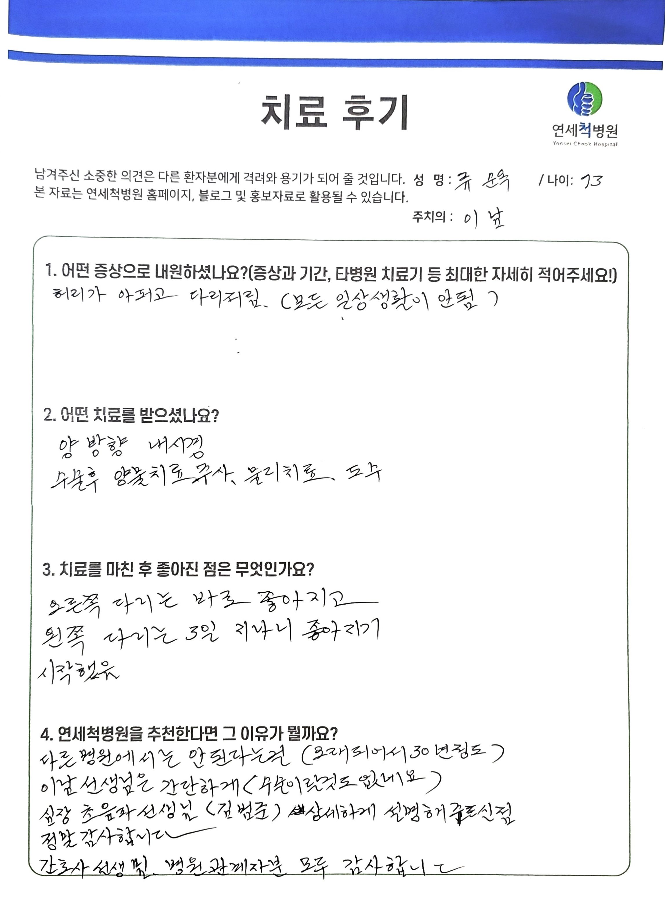 3. 치료를 마친 후 좋아진 점은 무엇인가요? 오른쪽 다리는 바로 좋아지고 왼쪽 다리는 3일 지나니 좋아지기 시작했음