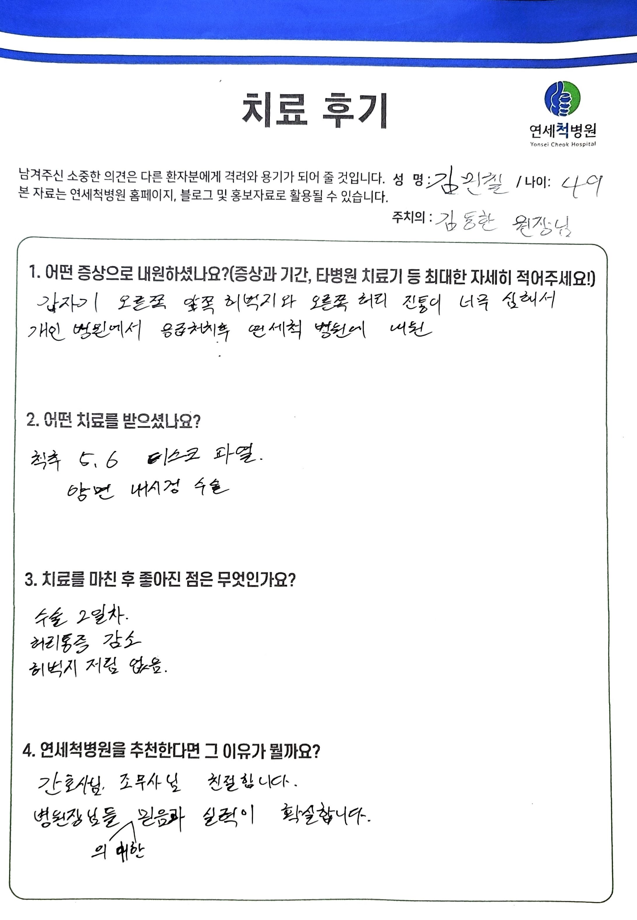 3. 치료를 마친 후 좋아진 점은 무엇인가요? 수술 2일차 허리 통증 감소, 허벅지 저림 없음