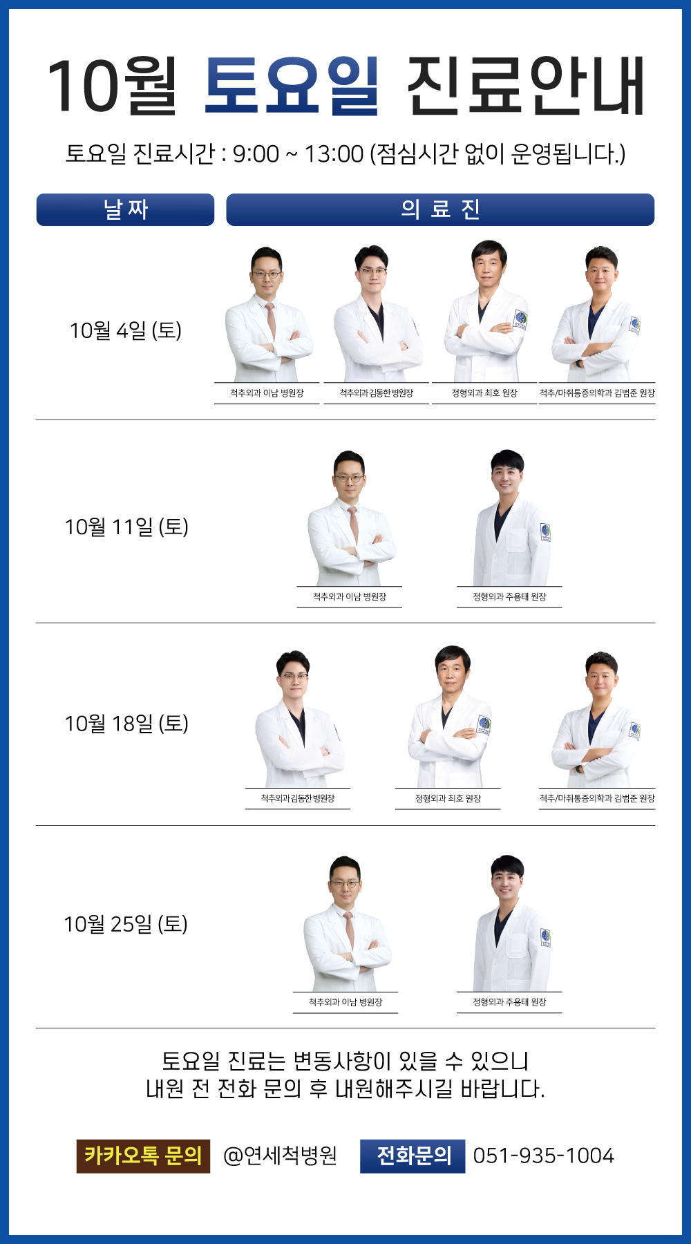 2025년 10월 토요일진료/과별 진료안내 연세척병원 | 2025-09-22 | 266 회 2025년 10월 토요일 진료일정 안내드립니다. 내원 전 꼭 스케줄을 확인해주세요^^ 051) 935-1004 10월 8일[수] 주용태 원장 휴진 + 22.jpg ( 49.32 [Kb] ) 윗글 ▲ 2025년 11월 토요일진료/과별 진료안내 아랫글 ▼ 추석연휴 진료안내 목록보기 글작성 시 입력하셨던 비밀번호를 입력하세요.