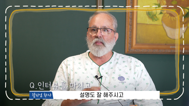 한국 병원에서의 특별한 경험, 윌리엄의 이야기 연세척병원 | 2025-10-20 | 121 회 지난주 수술받으셨던 윌리엄 환자분이“너무 잘 치료받고 간다”며 감사의 마음을 전해주셨어요!그 진심이 담긴 인터뷰 영상 함께 나눕니다 https://youtu.be/50dNBoWAS4Y?si=4gNbcSA1AmoffruA 링크를 클릭하시면 보실 수 있습니다. 목록보기 글작성 시 입력하셨던 비밀번호를 입력하세요.